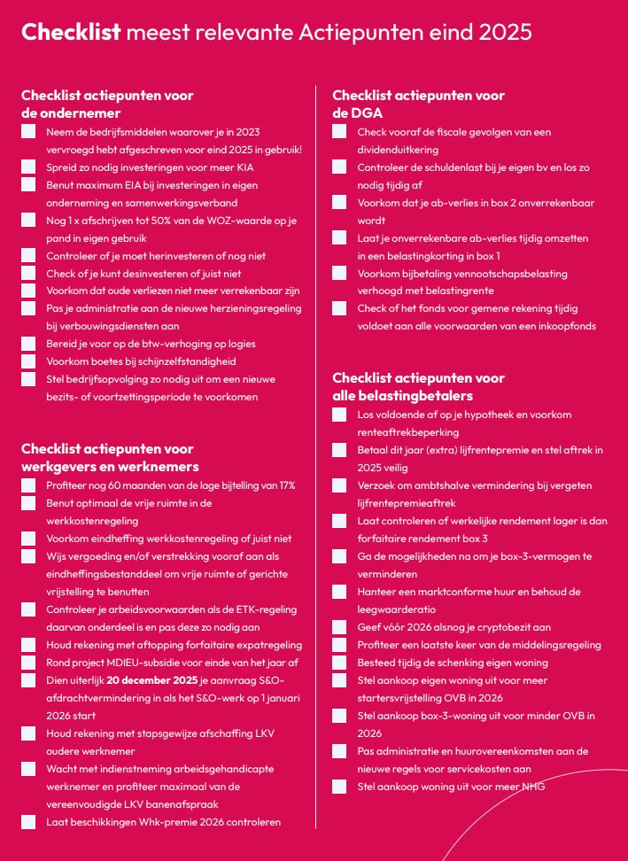 Het einde van het jaar is hét moment om vooruit te kijken: wat verandert er in 2026, en welke stappen kun je in 2025 nog zetten om fiscaal en financieel optimaal te handelen? De overheid heeft opnieuw een reeks wijzigingen aangekondigd die impact hebben op ondernemers, DGA’s, werkgevers en particulieren. Sommige regelingen lopen af, andere worden aangescherpt, en een aantal nieuwe verplichtingen gaan binnenkort in.  Daarom is het belangrijk om nu al scherp te hebben welke ontwikkelingen er spelen en welke acties je dit jaar nog kunt nemen om goed voorbereid het nieuwe jaar in te gaan. Lees je weer met ons mee?